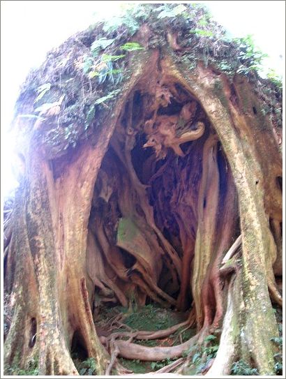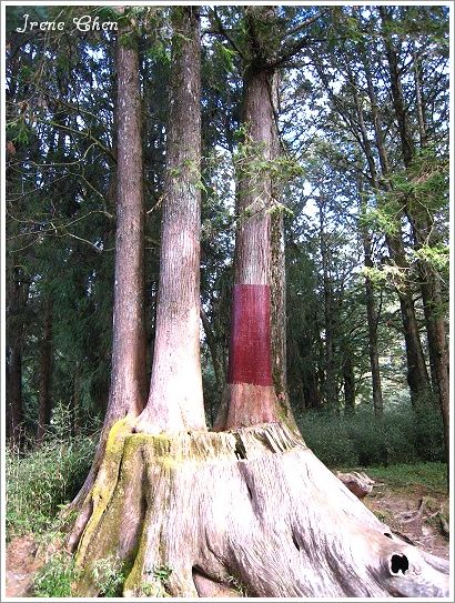 四姊妹。砍伐後遺留的檜木頭,恰巧有天然的紅檜種子飄落其上,恰好長成四株紅檜大樹。